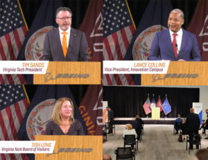 Innovation Campus Vice President Lance Collins and VT Board of Visitors’ Tish Long also delivered speeches marking the occasion. As the Washington Post reported, Boeing’s donation will be the largest corporate gift to the university, based in Blacksburg, Va., and will match Virginia Tech’s largest gift ever.
